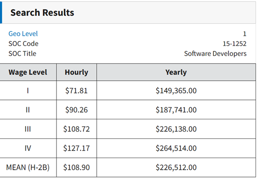 Assume the same facts as above—where the employer must register an experienced Sr. Software Engineer in Santa Clara County, California, but this employer typically uses alternative wage surveys to determine compensation. The employee’s offered salary is $225,000. The alternative salary survey shows the Sr. Software Engineer with that number of years of experience that would be equivalent to Level IV on the OEWS wage data would receive a salary of $221,000. Despite the alternative salary survey indicating an appropriate wage is $221,000, the Employer must select Level II on the H-1B cap registration since the offered salary of $225,000 does not meet or exceed Level III or Level IV OEWS wage data (as shown above). Thus, even though an employer may use the alternative salary survey to prove it meets the requirement to pay the appropriate wage for the position, the weighted registration only considers the OEWS data.